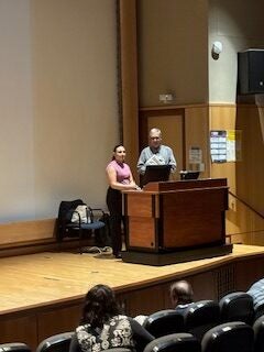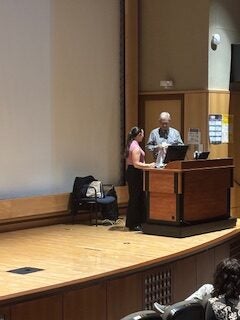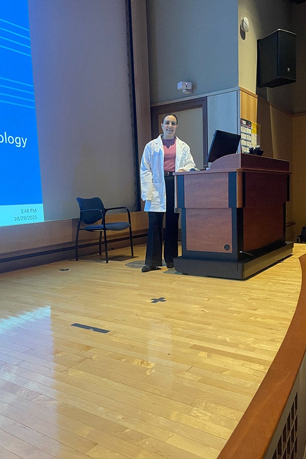 Dr. Marissa Bivins in her White Lab Coat at the podium after successfully defending her PhD thesis.