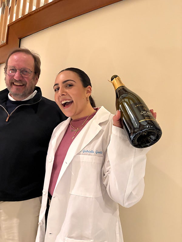 Gabi Gentile, PhD, at the podium at her defense Gabi Gentile, PhD, and mentor, Rob Nicholas Gabi Gentile, PhD and Rob Nicholas celebrate her successfully defending her PhD. Henrik Dohlman, Chair, and Gabi Gentile, PhD, at her Pharmacology white lab coat ceremony. Henrik Dohlman, Chair, presents Gabi Gentile, PhD, with her pharmacology white lab coat. Gabi Gentile, PhD, holding her white coat after defense. Henrik Dohlman, Chair, stands next to her. Gabi Gentile, PhD, holds up her pharmacology white lab coat after her successful defense.