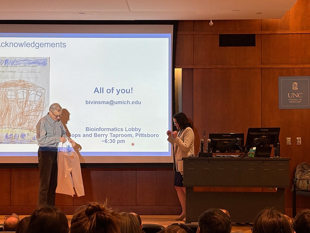 Dr. Marissa Bivins presents at the podium at her PhD thesis defense with a slide on the wall behind her. Dr. Marissa Bivins at her White Lab Coat Ceremony after her PhD defense with Dr. Henrik Dohlman. Dr. Henrik Dohlman, Chair of Pharmacology congratulates Dr. Marissa Bivins for successfully defending her thesis.